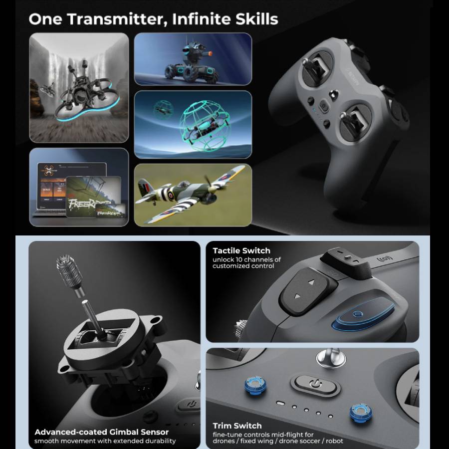 The LiteRadio 4 is BetaFPV’s compact yet powerful entry-level transmitter, built with an internal ExpressLRS 2.4GHz module and multiple customisable switches. Its ergonomic design, lightweight body and balanced weight make it ideal for training, travel or casual field flying. It features Bluetooth for simulator connectivity and a long-lasting 2000mAh internal battery to provide a practical bridge between beginner and advanced control.