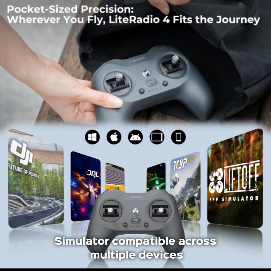 LiteRadio 4 is designed to work with popular FPV simulators like VelociDrone, Liftoff, TRYP, Erea Drone, DRL, DCL, DJI, etc. Whether you're on a desktop, Android device, or tablet, LiteRadio 4 ensures smooth compatibility across all platforms. With the added Xbox mode, you can even use the DJI Flight Simulator on a Windows PC.