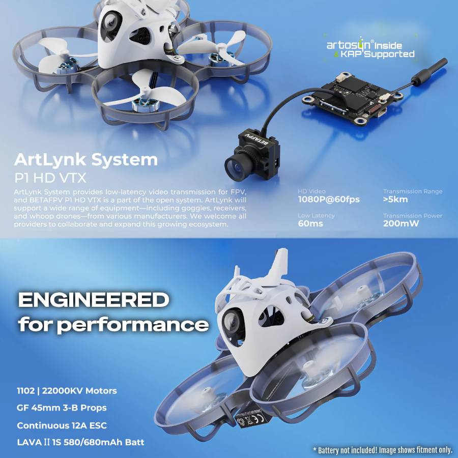 - Recommended Battery (not included): LAVA II 1S 580mAh/680mAh Battery