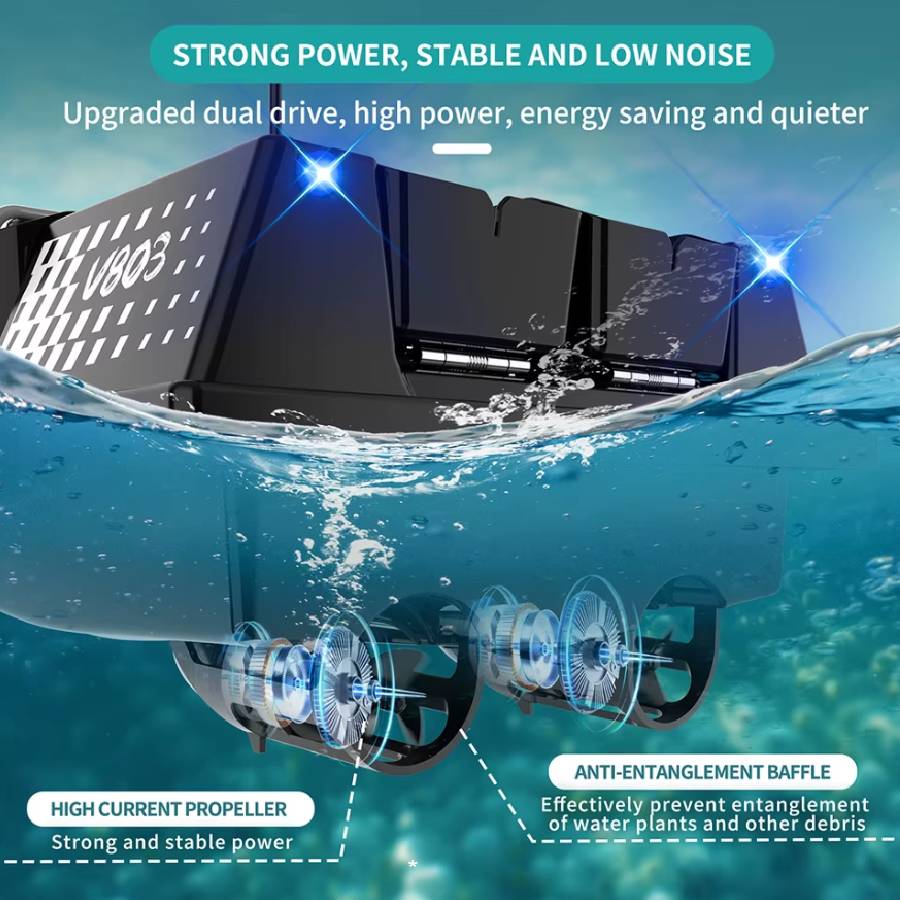 This model adds more features over the standard V803: dual Beidou+GPS navigation with autopilot and up to 4 fishing grounds & 200 anchor points within each area. The GPS function enables route planning, cruise control and automatic return functionality for increased precision and repeatable bait placement.