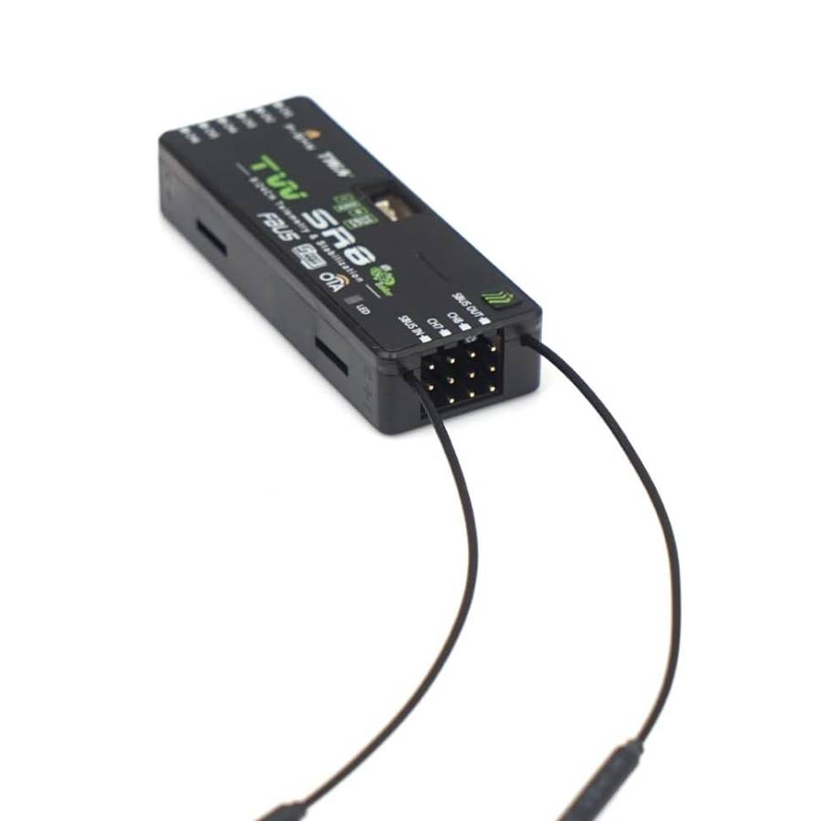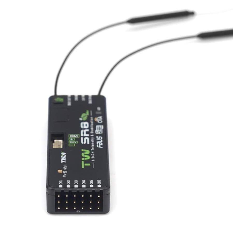 The TW GR8 receiver is equipped with 2x 2.4G antennas. The signal output ports include one SBUS output channel and 8 PWM output channel ports. It also supports telemetry functions through FBUS / S.Port. By setting the TW GR6 to use FBUS protocol in the ETHOS system, the signal control and telemetry can be connected to any device that supports FBUS protocol through only one line to achieve bidirectional transmission, also simplifying the model build using fewer wires. In addition to all this, the inverted S.Port on the receiver can allow for easily connecting flight controllers.