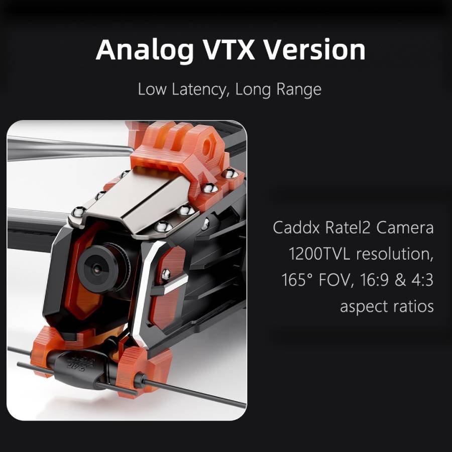 The inclusion of the DJI O4 Air Unit Pro (on the “O4 Pro” version) delivers high-resolution, low-latency HD video and recording, while pilots who prefer to fly analogue can take the alternate option of the Caddx Ratel2 fitted version.