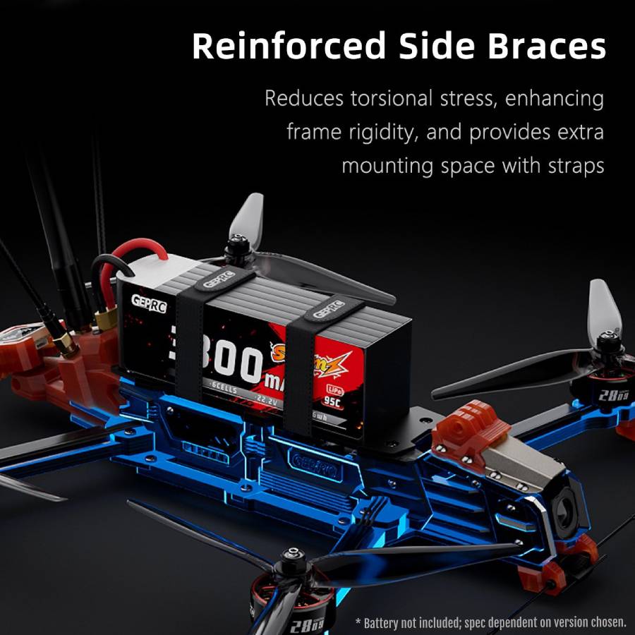 - Reinforced GEP-MOZ7 V2 frame with thick arms and strong construction for increased stability and durability on long flights.