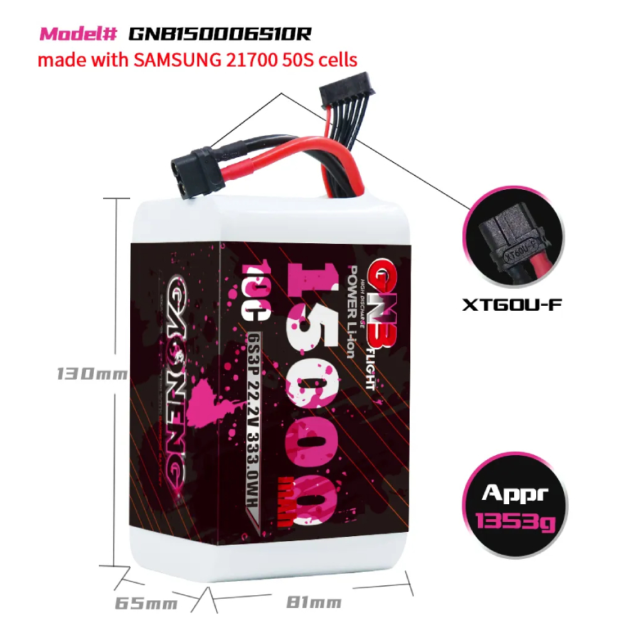 - Model: GNB 15000mAh 6S 10C Li-ion Battery with XT60 and XH2.54 (7 pin) balance connector