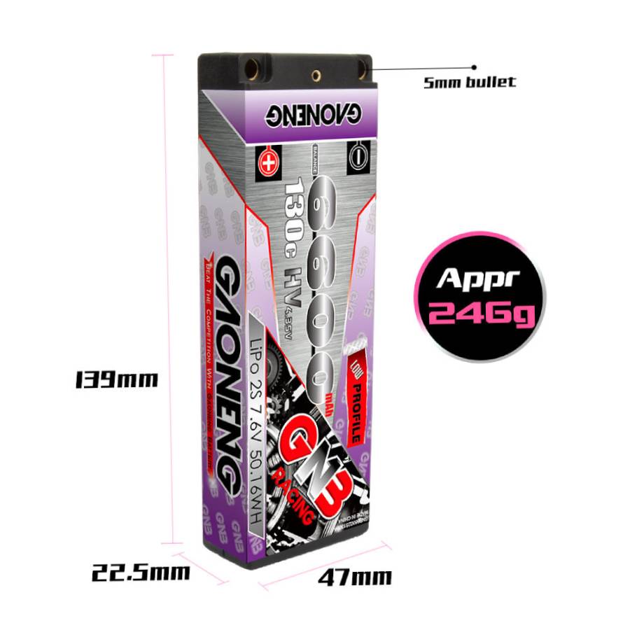 The GNB 6600mAh 2S 130C LiHV Battery is a high-quality LiHV (High Voltage Lithium Polymer) battery manufactured by GNB. It features a rating of 130C for constant discharge up to 260C for short bursts. The battery is fitted with 5mm bullet connectors. The connection wire has 5mm bullet connectors and terminates to a Deans connector with JST-XH Balance lead built in. The connector can easily be changed to an alternative connector, such as an XT60 as the connector lead is removable.