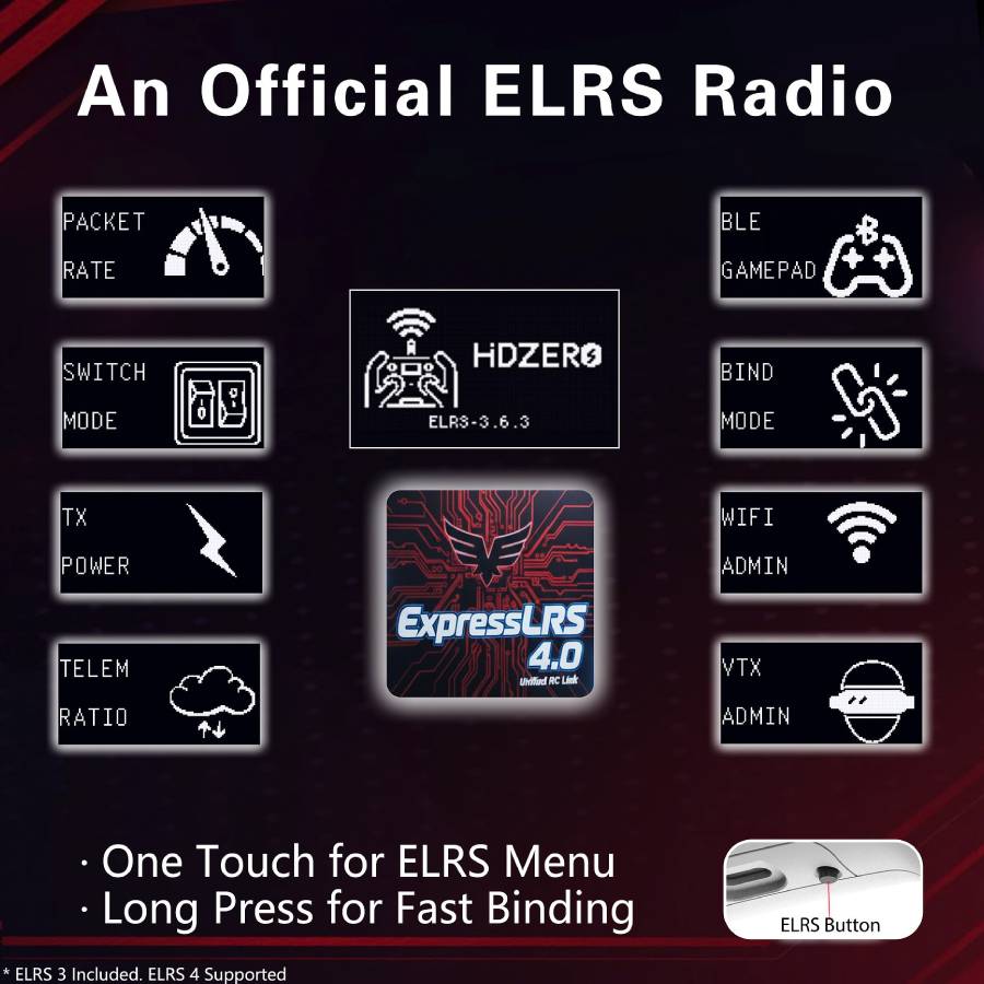 - One-press ELRS binding shortcut simplifies connecting receivers and getting airborne quickly.