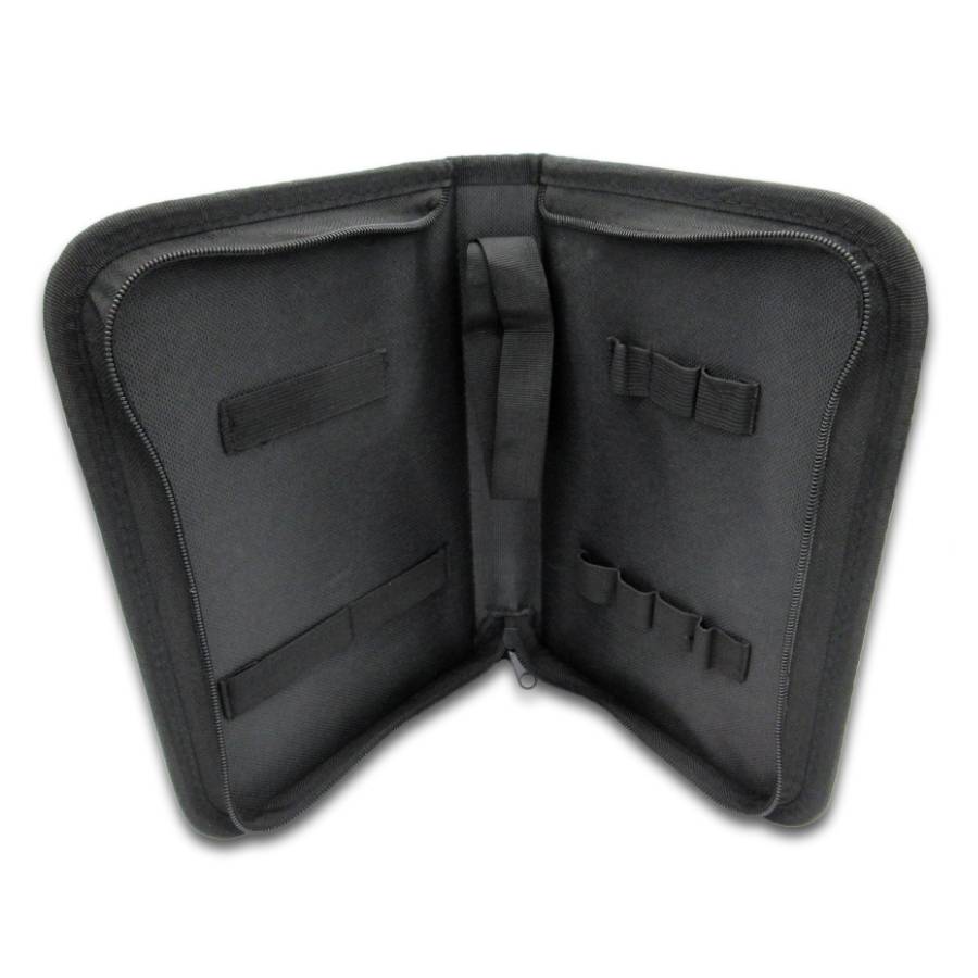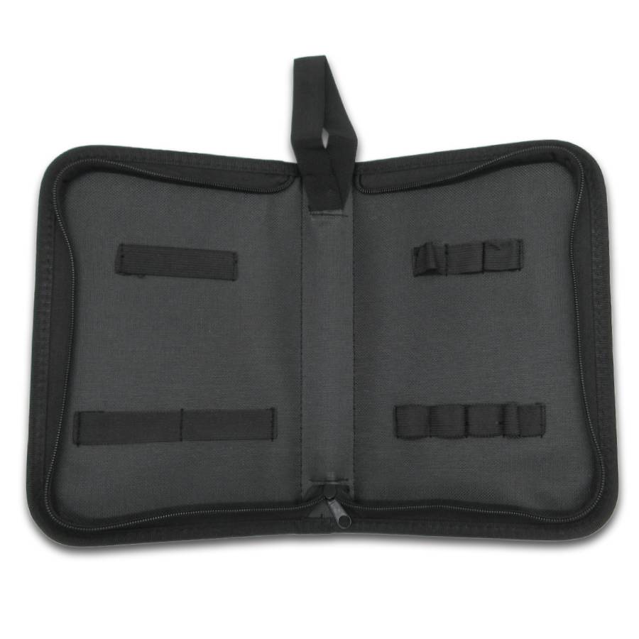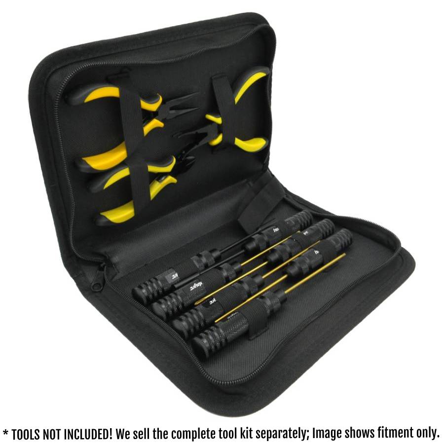 The HobbyRC Tool Pouch is designed to carry 7 drivers and 3 hand tools, such as pliers. The case has elasticated retaining loops to hold any tools in place. The outer shell is made of a black leather-effect finish with a built-in nylon carry strap and zipper closure. This is the same case that we sell equipped with HobbyRC tools (see below).