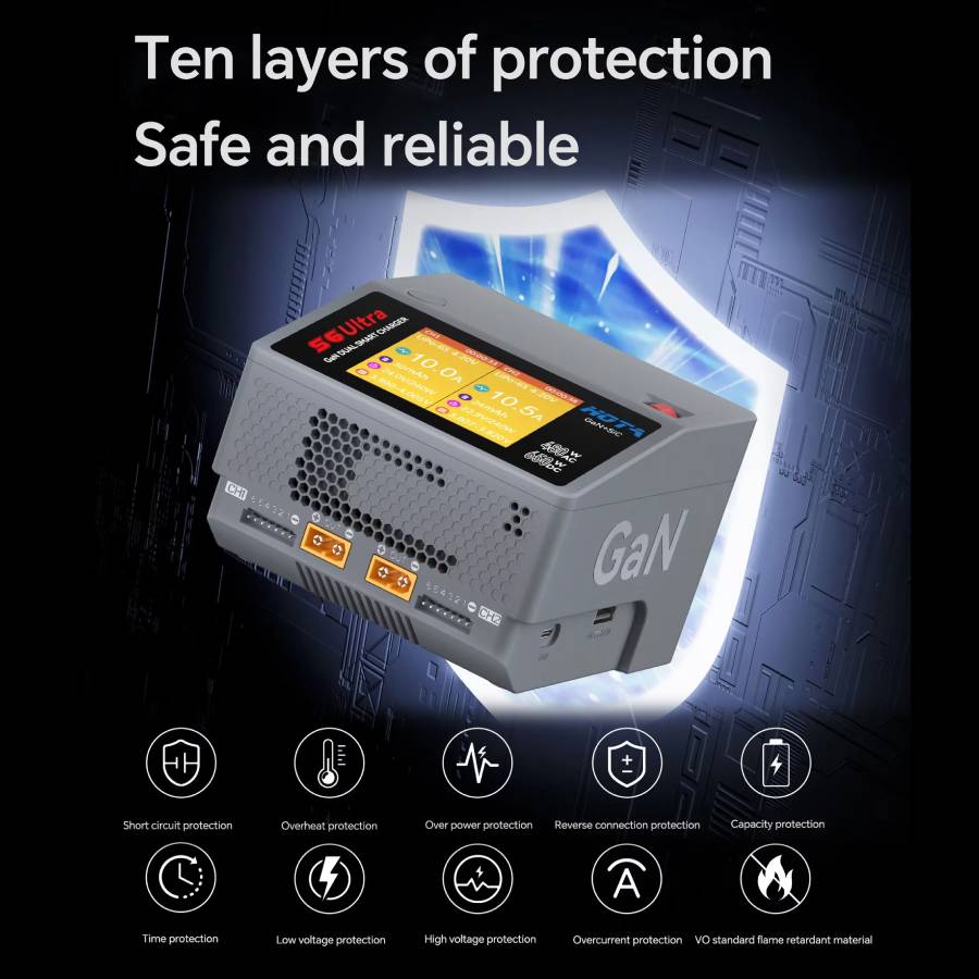 At its core, the S6 Ultra utilises advanced GaN-based power conversion technology, improving efficiency while reducing heat and overall size. Each channel is capable of delivering up to 325W on DC input, making it suitable for a wide range of LiPo, LiHV and other common battery chemistries up to 6S. A clear backlit display and simple control interface provide easy access to charging modes, while additional features such as USB outputs and wireless charging capability extend its usefulness beyond battery management.