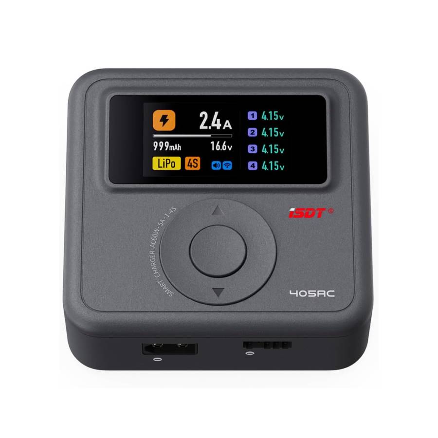 The ISDT 405AC is a compact AC-input smart charger designed for hobbyists and RC enthusiasts who want a straightforward, reliable way to maintain and balance small to medium battery packs without needing a separate power supply. It plugs directly into standard AC mains and supports a broad range of battery chemistries, delivering precise balance charging and integrated safety protections in a portable format. Its clear colour LCD and intuitive controls make operation simple, for charging commonly used LiPo or LiHV battery packs up to 4s.