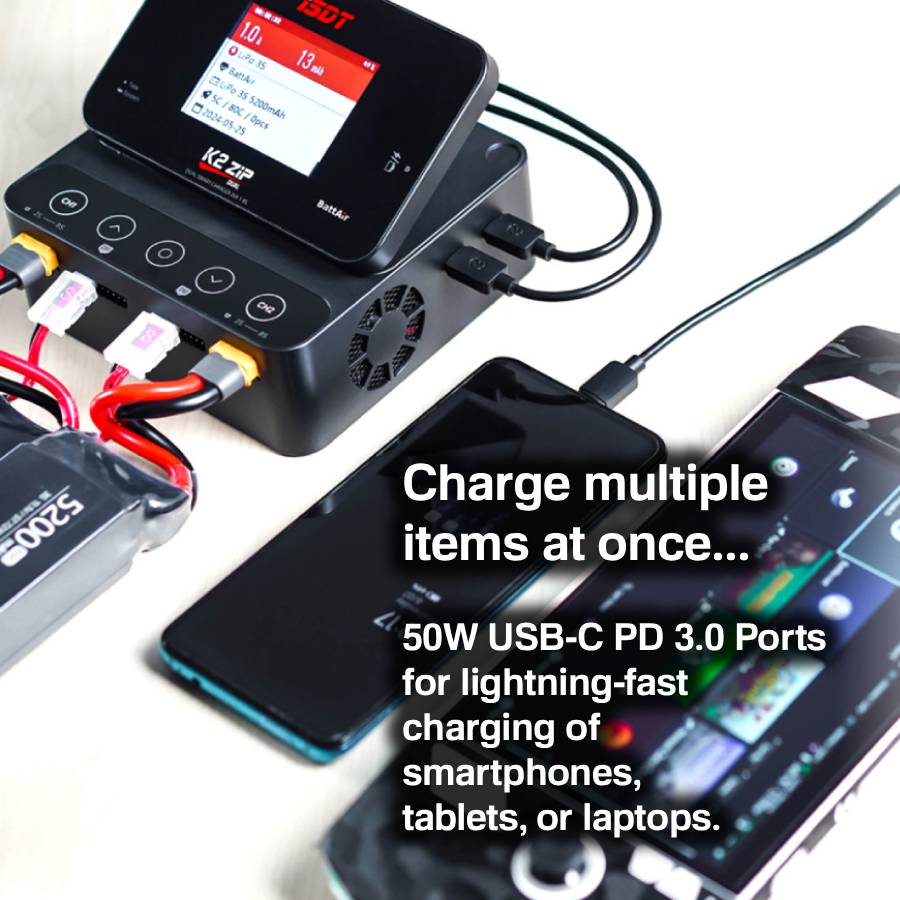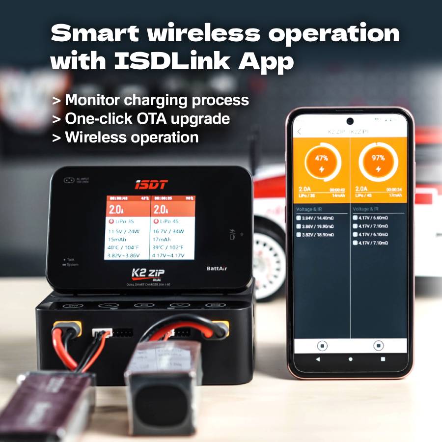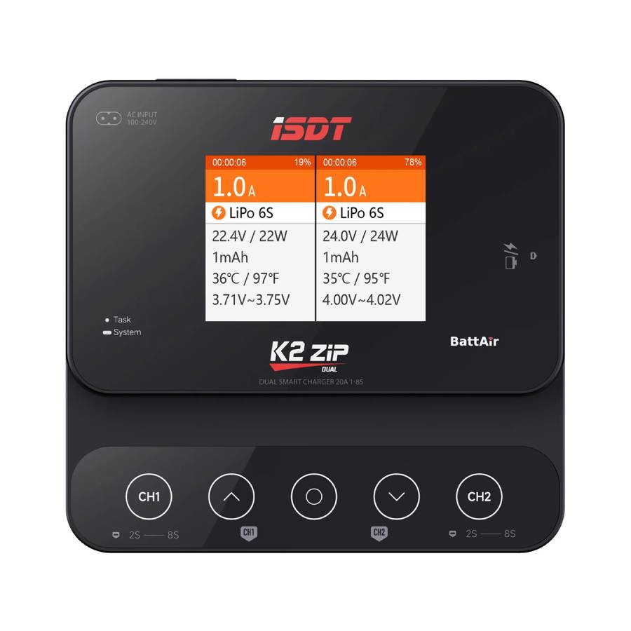 The ISDT K2 ZIP is a versatile dual-channel AC/DC smart battery charger designed for hobbyists and professionals who need reliable battery management for a range of battery types. It combines a built-in mains power supply with DC input compatibility to offer flexible charging options at home, at the workshop, or in the field. The user interface features a clear IPS display and intuitive controls, while support for BattAir smart battery monitoring and USB-C PD power delivery adds practical convenience for modern workflows.
