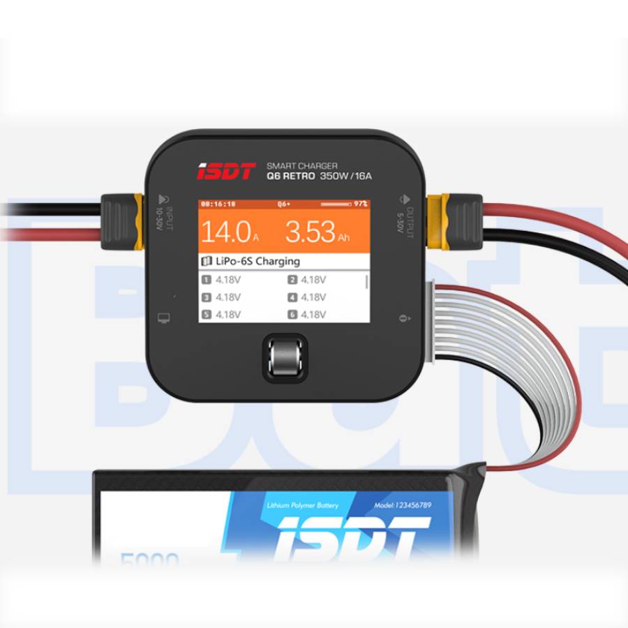 The ISDT Q6 Retro is a compact DC-input battery balance charger built for hobbyists who need reliable power management in a compact palm-sized device. It accepts a wide DC supply range and supports a broad selection of battery chemistries up to 6S LiPo and 16S NiMH. Its simple interface with backlit display and intuitive controls makes setup straightforward, while active cooling and smart charging technologies help maintain safe and efficient charge cycles. The Retro uses te ISDT mobile app for wireless operation via “ISDLink”. This allows you to preset charging tasks and monitor the charging process at any time.