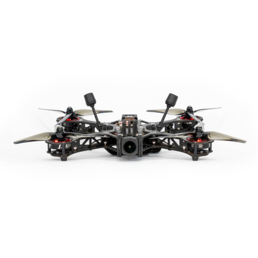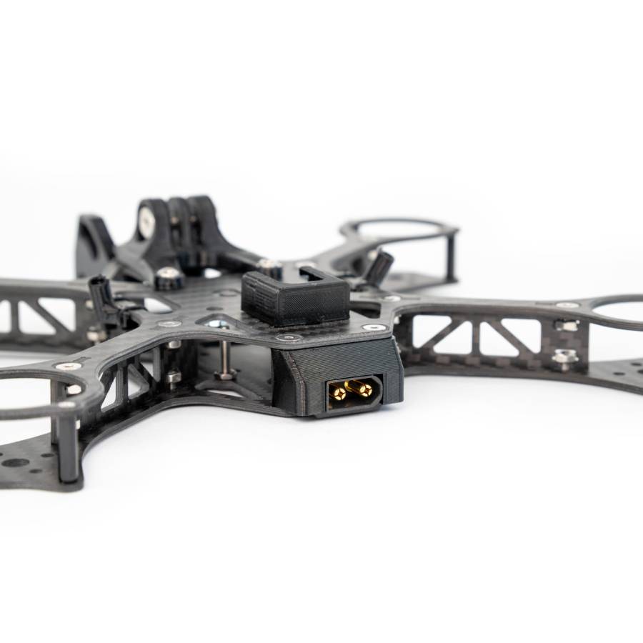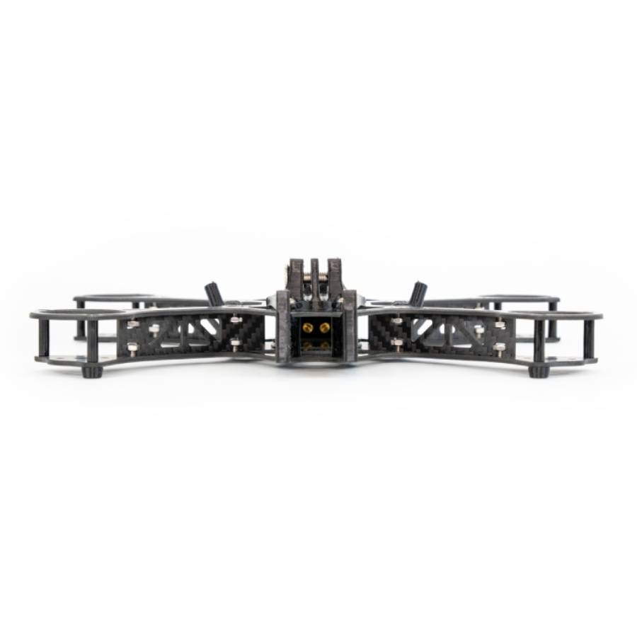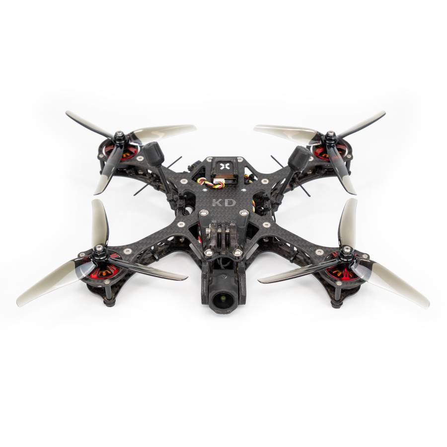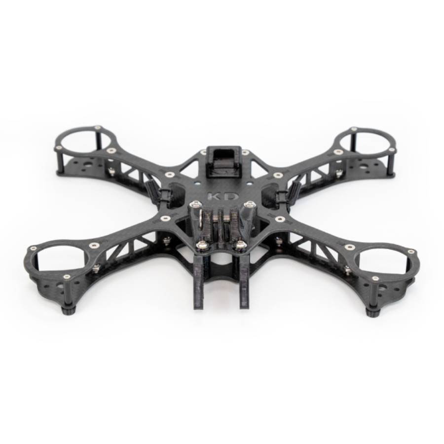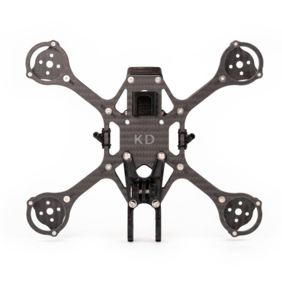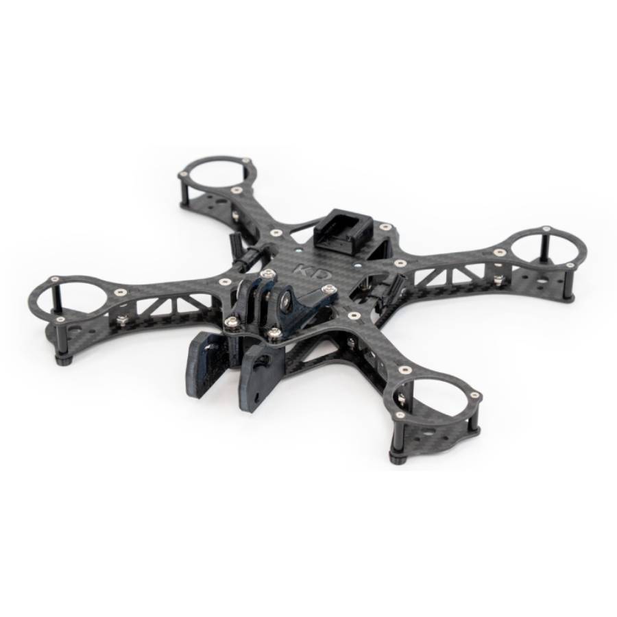 KD5 is a 5" quad designed to carry an action camera or just a DJI O4 Pro. It places motors inside the arms for the lowest profile 5" possible, and has a unique I-beam design made of vertical arms clamped between two continuous plates. This creates an insanely strong and stiff structure, while packing a huge number of features into a 95g frame. The weight and efficient design allow up to 9 minute flight times with an action camera.