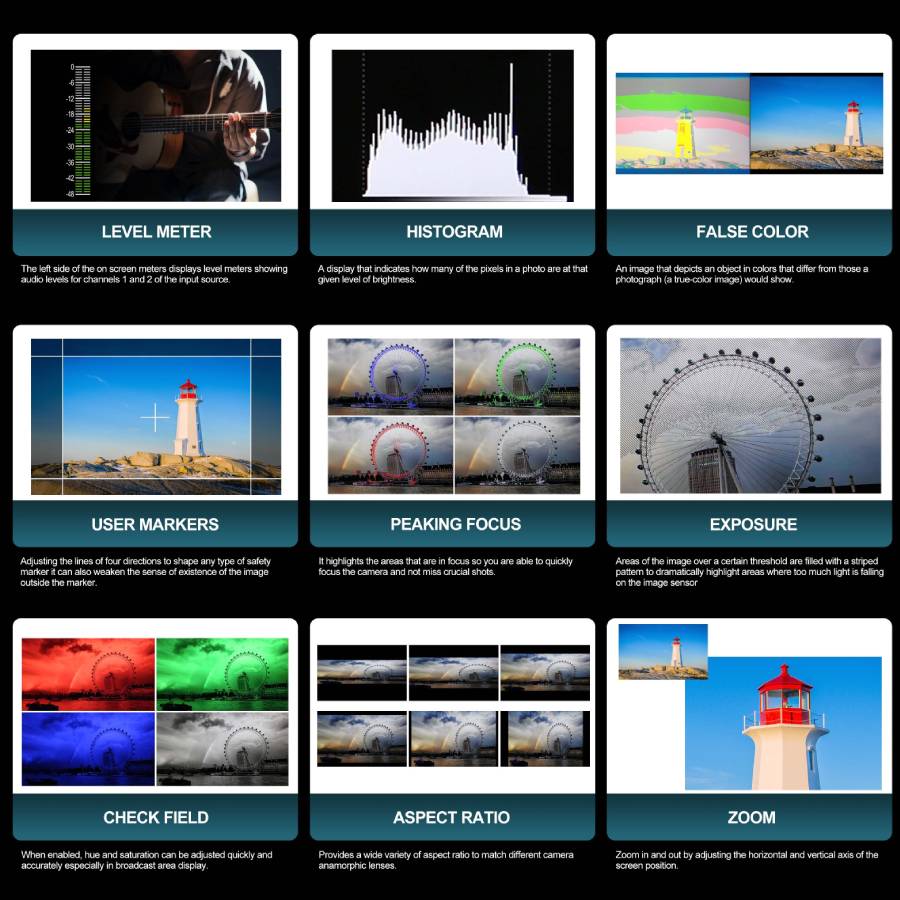 - Waveform, vectorscope and exposure analysis tools for accurate monitoring