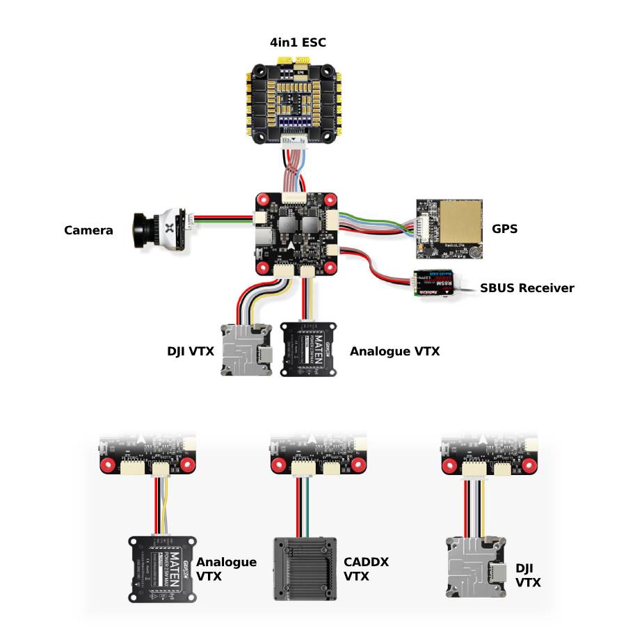 - Compatible 'plug n play' interface with several brands of VTX, including Caddx and DJI.