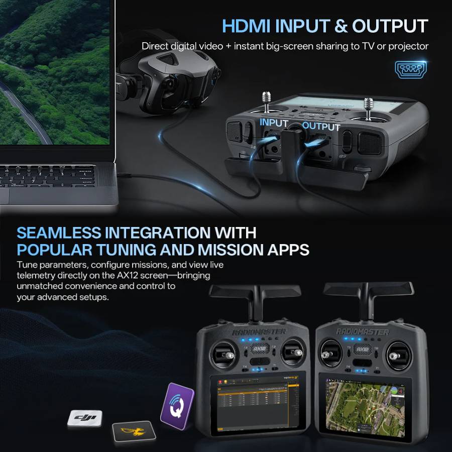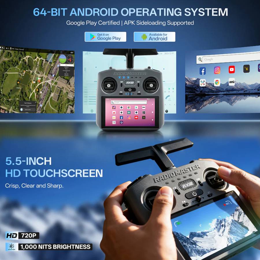 The Radiomaster AX12 brings together advanced Android performance, built-in ExpressLRS connectivity, HDMI video support, powerful processing, and app compatibility - working seamlessly to unlock new ways to build, control, and innovate.