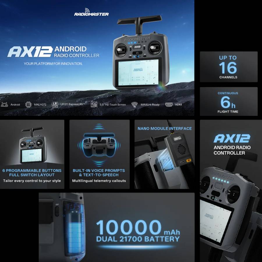 At its core, the AX12 merges Radiomaster’s proven radio control system with RadiomasterOS, an Android-based platform that simplifies setup, configuration, and field operation without compromising control.