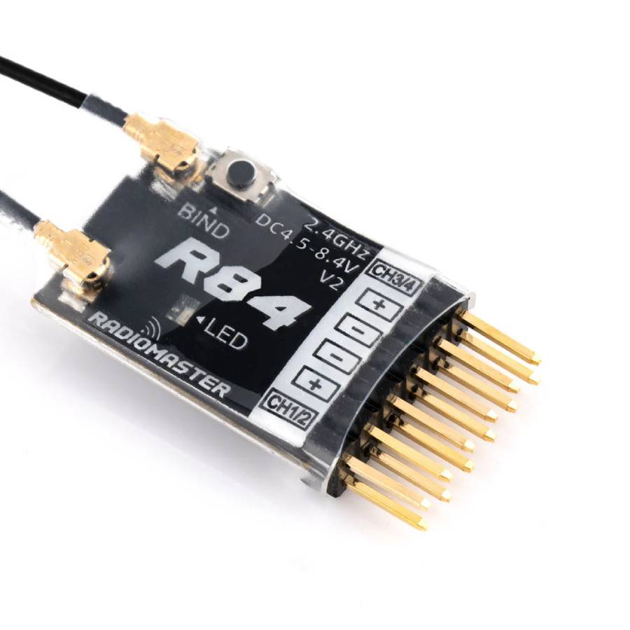 The Radiomaster R84 V2 is a compact, lightweight 4-channel receiver, ideal for multi-protocol radios that support legacy FrSky protocols. It’s designed to work with D8, D16 and Futaba SFHSS systems via a multi-protocol module, making it suitable for micro models, fixed-wing planes or simple builds where only a few channels are needed. With its strong signal range and minimal footprint, you can keep your build light without compromising on range or reliability.