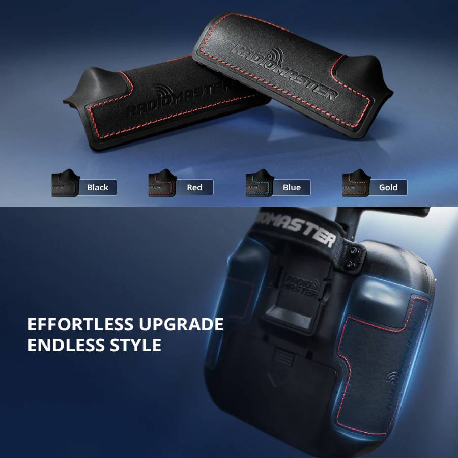 TX15 Leather Grips use colour-matched stitching to complement your transmitter. They are available in black, blue, gold, and red. They are an optional upgrade for the TX15 and included with the TX15 MAX as standard. They are a genuine Radiomaster original part, direct from the manufacturer.