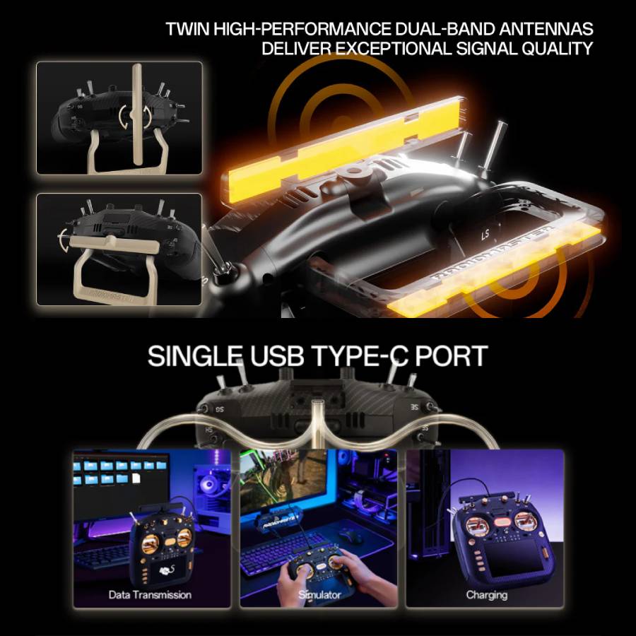 - Integrated dual-band Gemini ExpressLRS module supports simultaneous 2.4GHz and 900MHz transmission for robust link performance.