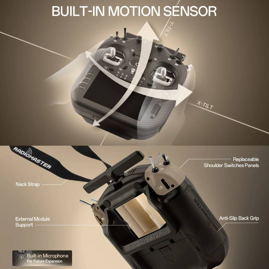 - Built-in motion sensor enables tilt-based control functions and telemetry triggers.
