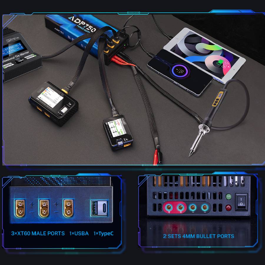 This power supply is particularly useful where simultaneous charging or powering of multiple RC chargers, tools and accessories is required without the complexity of multiple separate supplies. The ADP750 delivers stable DC power in a single compact unit with a broad AC input range, versatile outputs and a comprehensive protection system.