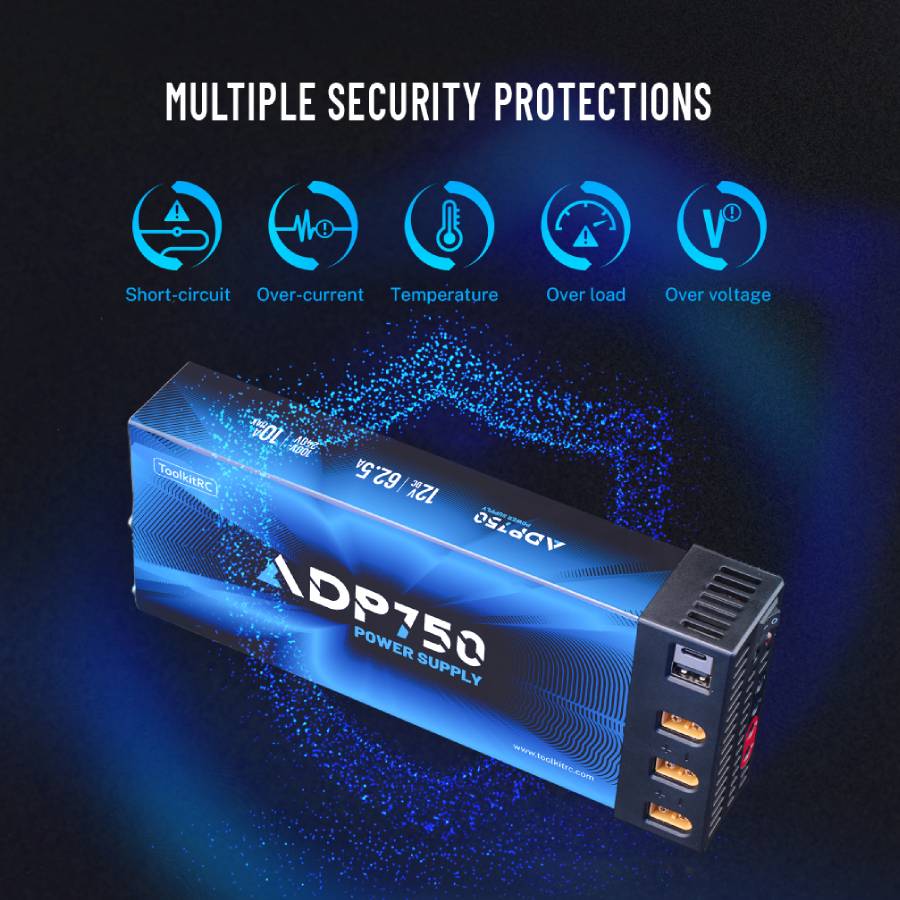 ToolkitRC ADP750 750W is a robust power supply built to consistently output 12V DC to multiple devices.