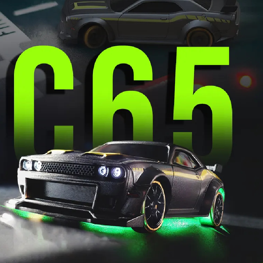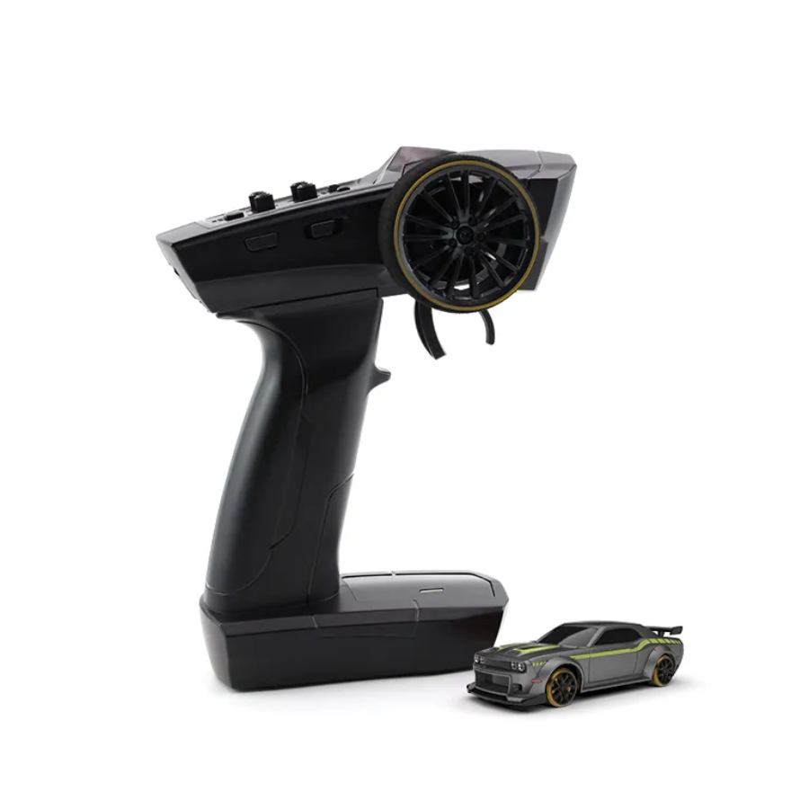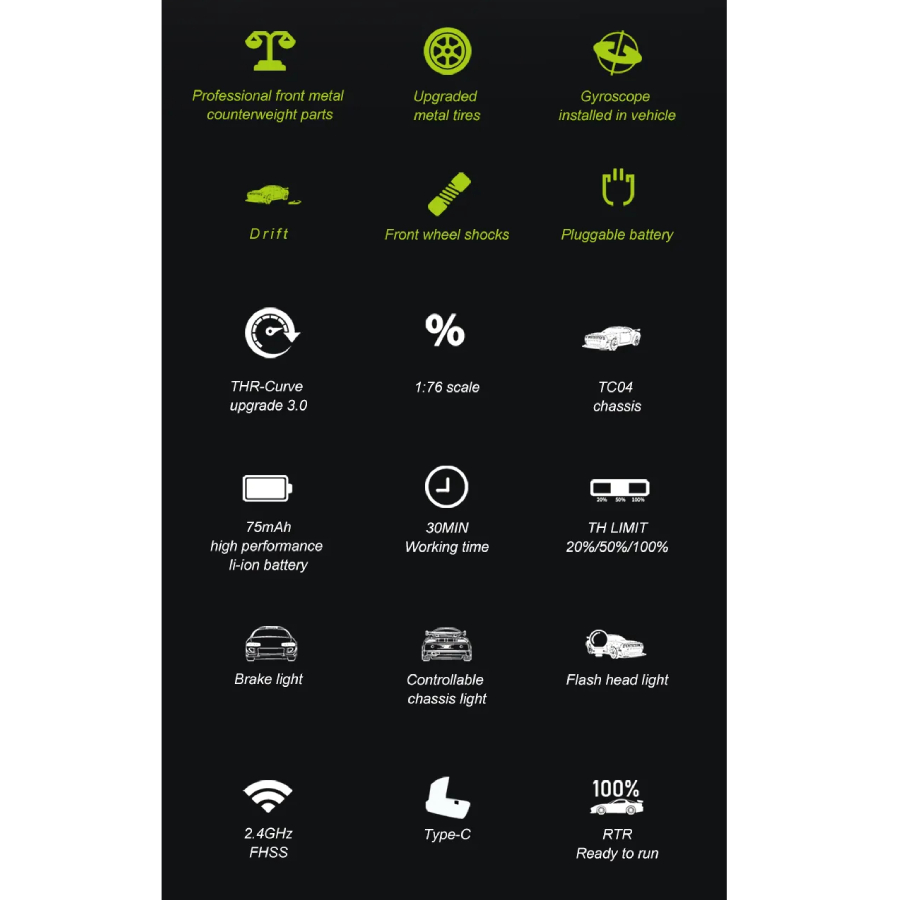 The Turbo Racing C65 drift car is a 1/76th scale remote control drift car with fully proportional controls and a built-in gyro. The C65 features a professional metal counterweight system and a brand new chassis. The C65 also features upgraded metal tyres and a slightly longer wheelbase, as well as front wheel suspension. The gyro stabilisation system helps keep control of the vehicle's attitude and direction when the car is out of control. Featuring a 2.4GHz fully proportional control system and features like headlights, brake lights and chassis lights. The C65 drift car charges over the USB-C port and the built-in 55mAh battery that provides up to 30 minutes of run time. The car's body shell can be disassembled, and 2 spare shells are included. This version comes in Blue.