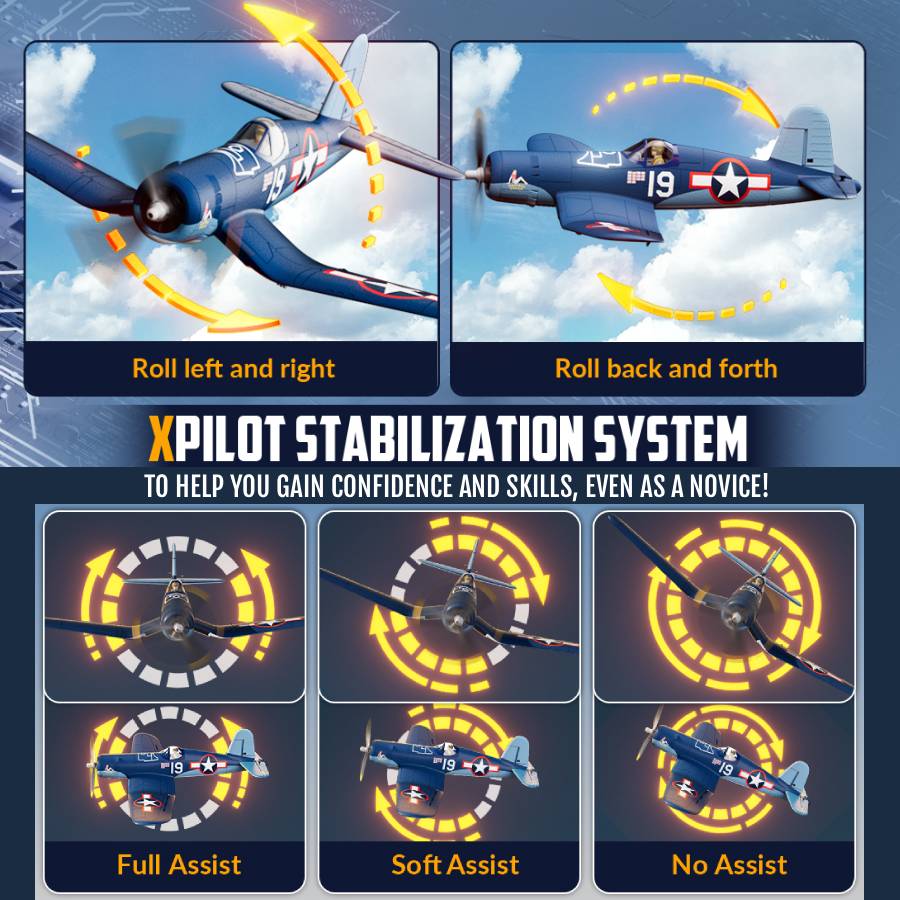 The Volantex RC F4U Corsair has a wingspan of 500mm, making it the larger version of the Volantex F4U Corsair featured in the Warbirds series. It's equipped with the Xpilot gyro stabiliser system, which has 3 levels of flight control assistance: "beginner" level with full assist, "intermediate" with partial assist and "expert" for manual control. This allows beginners to gradually gain confidence, while experts can show off their skills straight out of the box.